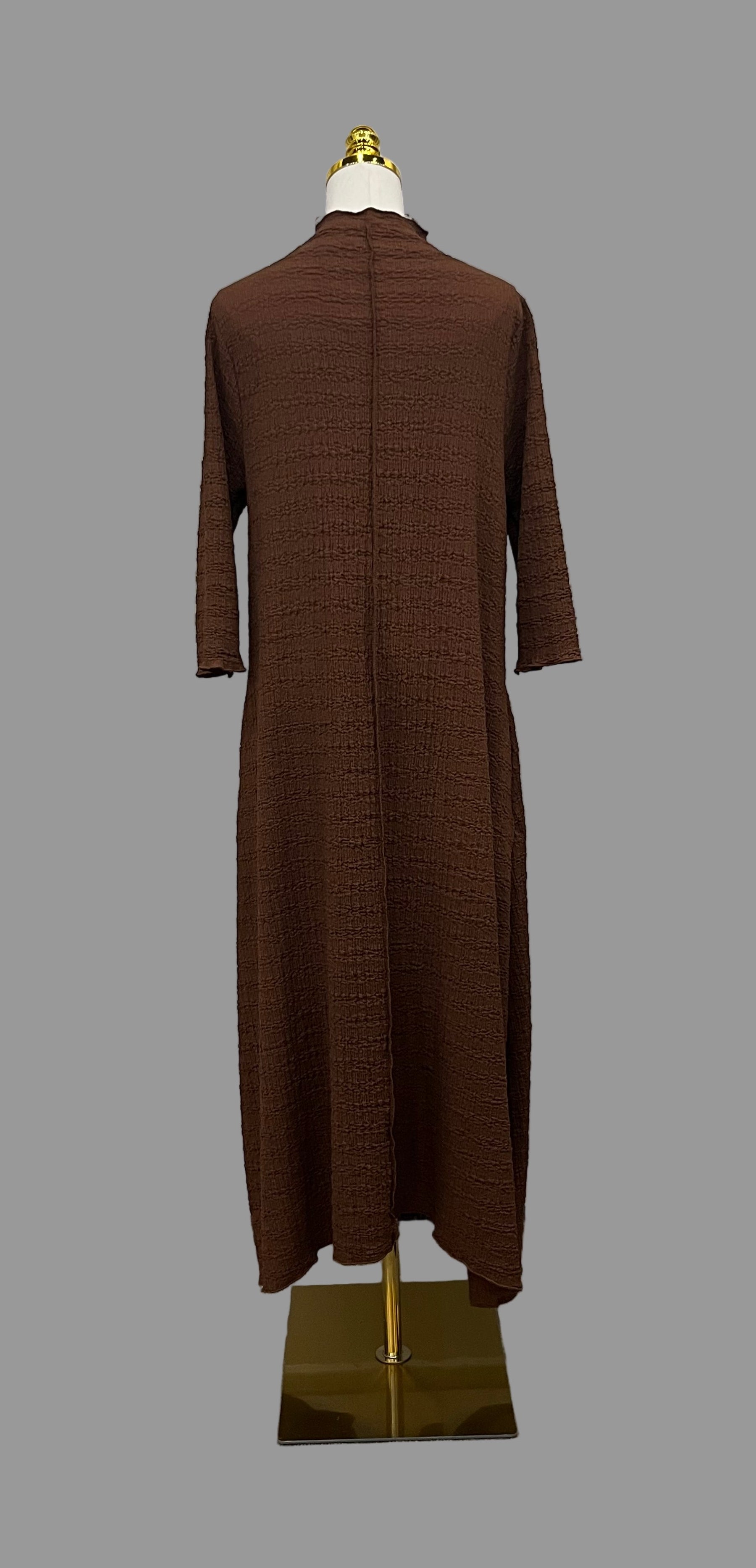 Elevate your wardrobe with this sophisticated midi dress, crafted from textured fabric that adds visual depth and dimension. The flowing silhouette drapes beautifully while maintaining its shape, complemented by three-quarter sleeves that strike the perfect balance between coverage and elegance. A meticulously detailed high neckline serves as a striking focal point, drawing attention upward with refined craftsmanship. Practical hidden pockets provide functional style, allowing you to carry essentials without compromising the dress's clean lines. The asymmetric hem creates movement and visual interest, making this chocolate-hued piece a versatile choice for both professional settings and elevated casual occasions.