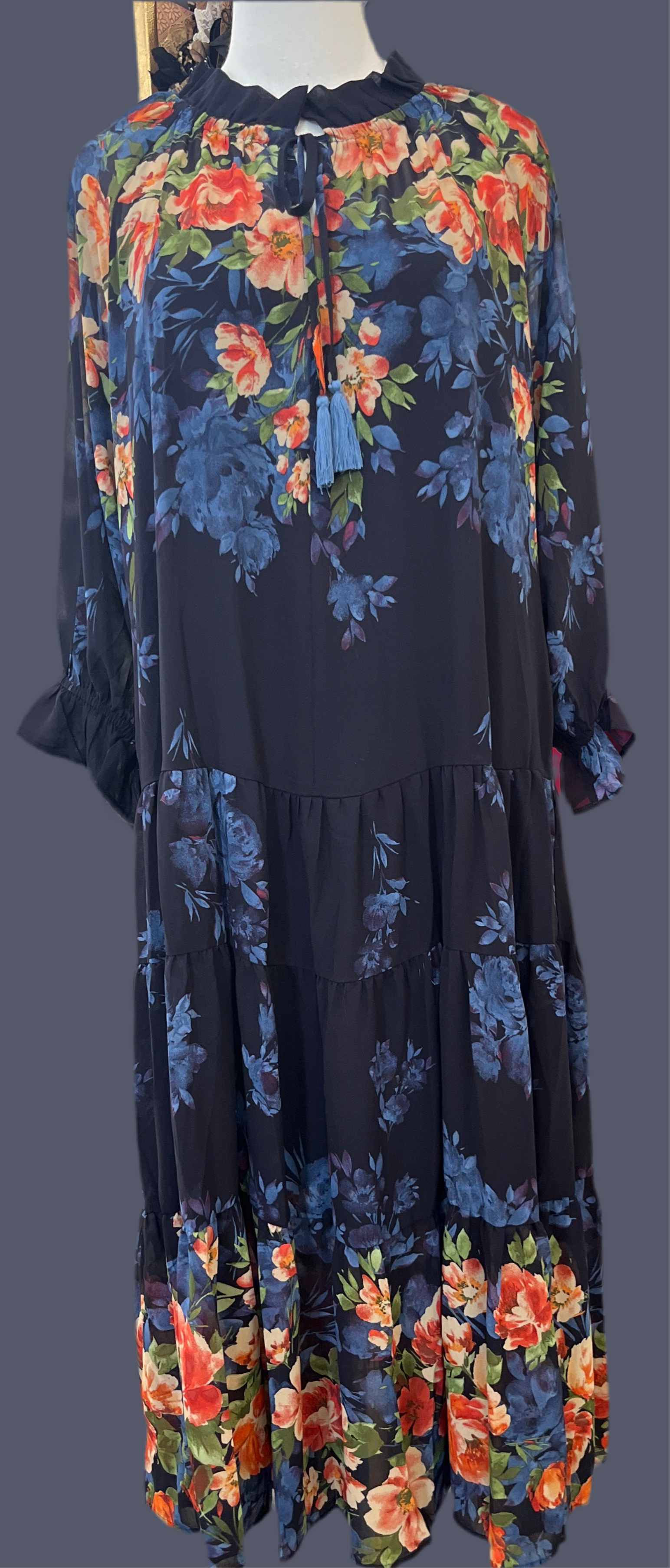 The Border Printed Dress - Night Sky features a flowy, tiered design adorned with elegant floral patterns. Its ruffled round neck includes a tie closure, allowing for adjustable fit and comfort. This dress combines aesthetic appeal with functional ease, suitable for various occasions.