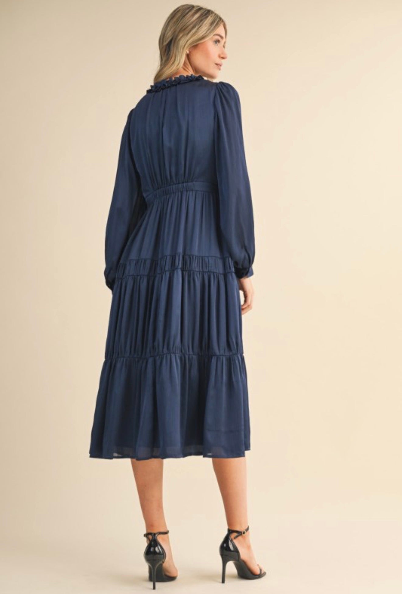 This Ruffle neck tiered dress in shiny navy is perfectly elegant and great for any occasion. Long sleeves, and ruffled details will add a touch of elegance to your wardrobe.