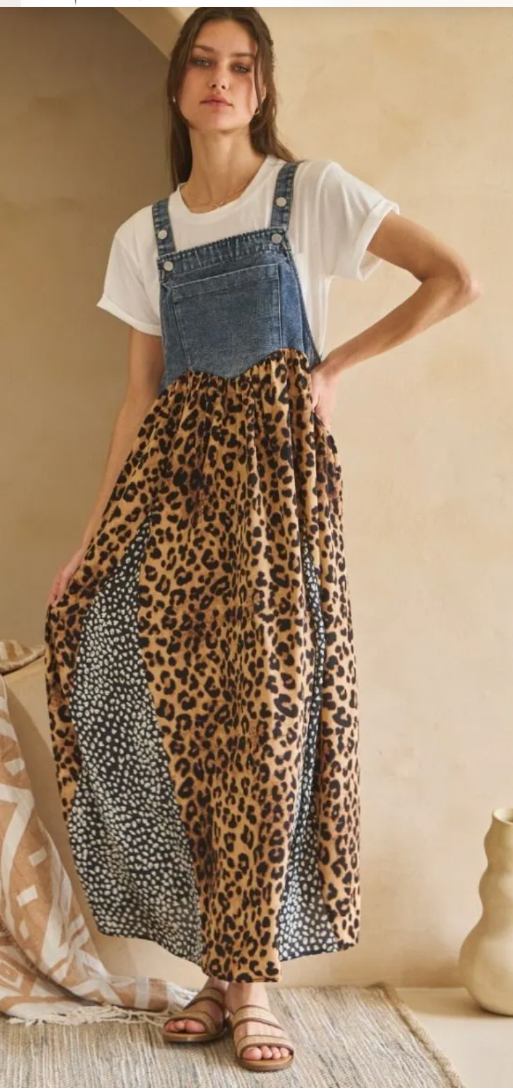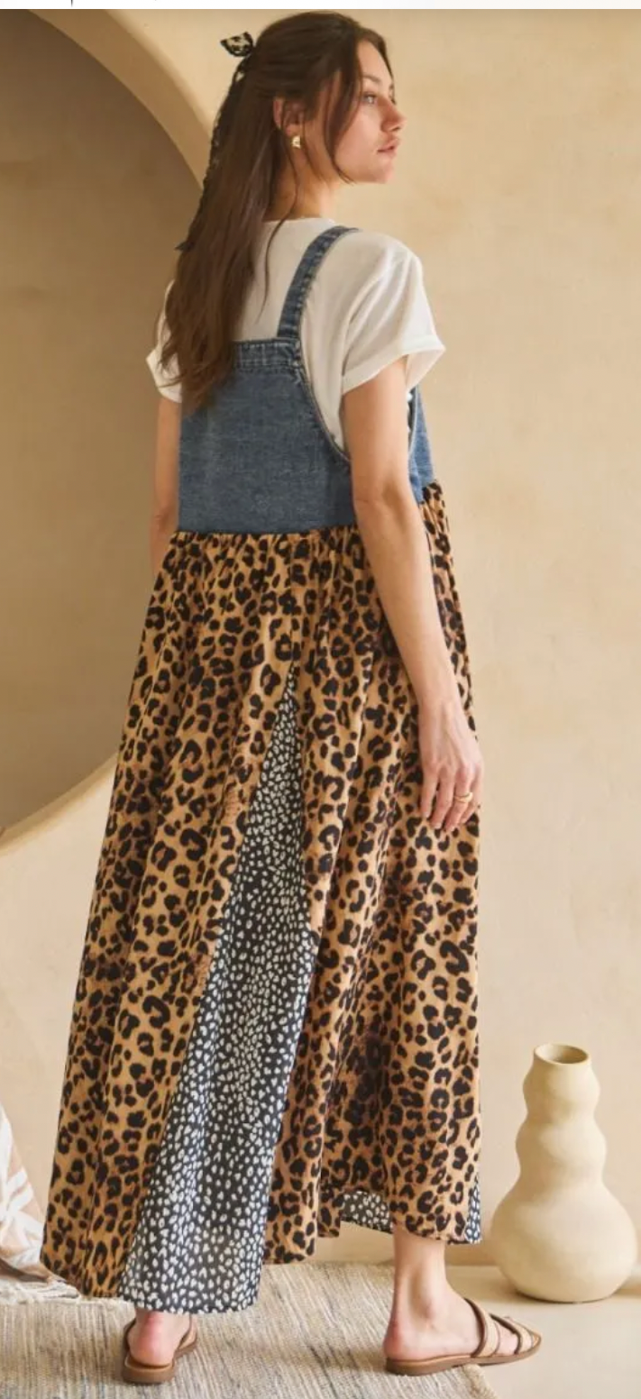 The Lia Dress-Denim Leo features a durable denim bodice paired with a leopard print skirt, blending style and comfort. This overall design offers ease of movement and versatility for various occasions, making it a practical addition to any wardrobe. Ideal for casual settings or layered outfits.