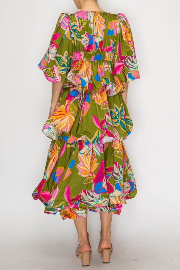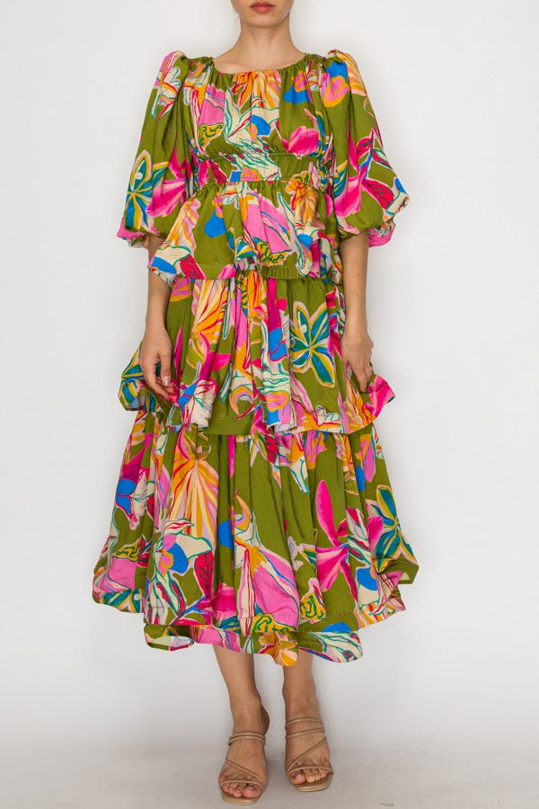 The Renee Dress in green exemplifies sophisticated craftsmanship with its refined construction details. A round neckline frames the face elegantly, while the back button closure ensures practical styling. Voluminous three-quarter puff sleeves deliver romantic flair and graceful proportions. The elasticized waist accommodates varied fits with ease, and cascading tiered ruffles create dimensional texture throughout. A quality lining provides structure and comfort, ensuring this dress maintains its polished appearance with every wear.