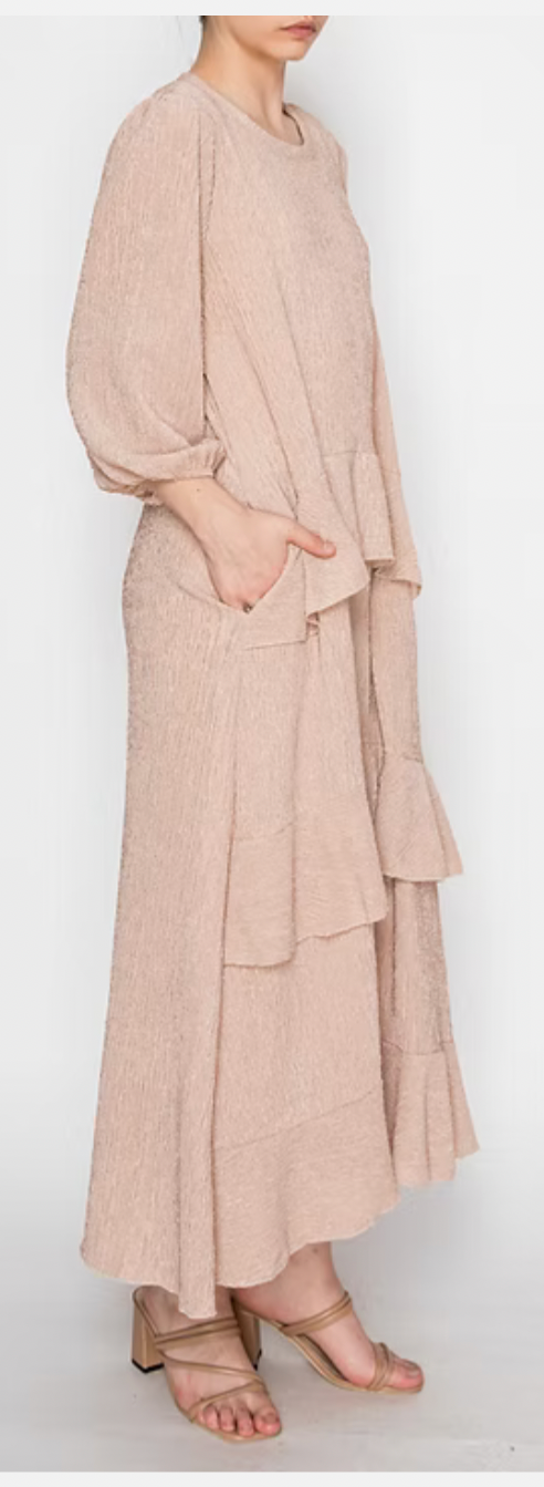 The Serena Dress in cream combines timeless elegance with everyday wearability. This sophisticated piece features a classic round neckline and flattering 3/4 sleeves that work beautifully across seasons. Delicate ruffles adorning the front add refined texture and visual interest, while the thoughtfully designed silhouette ensures all-day comfort. Perfect for elevating your wardrobe with a dress that balances style and ease.
