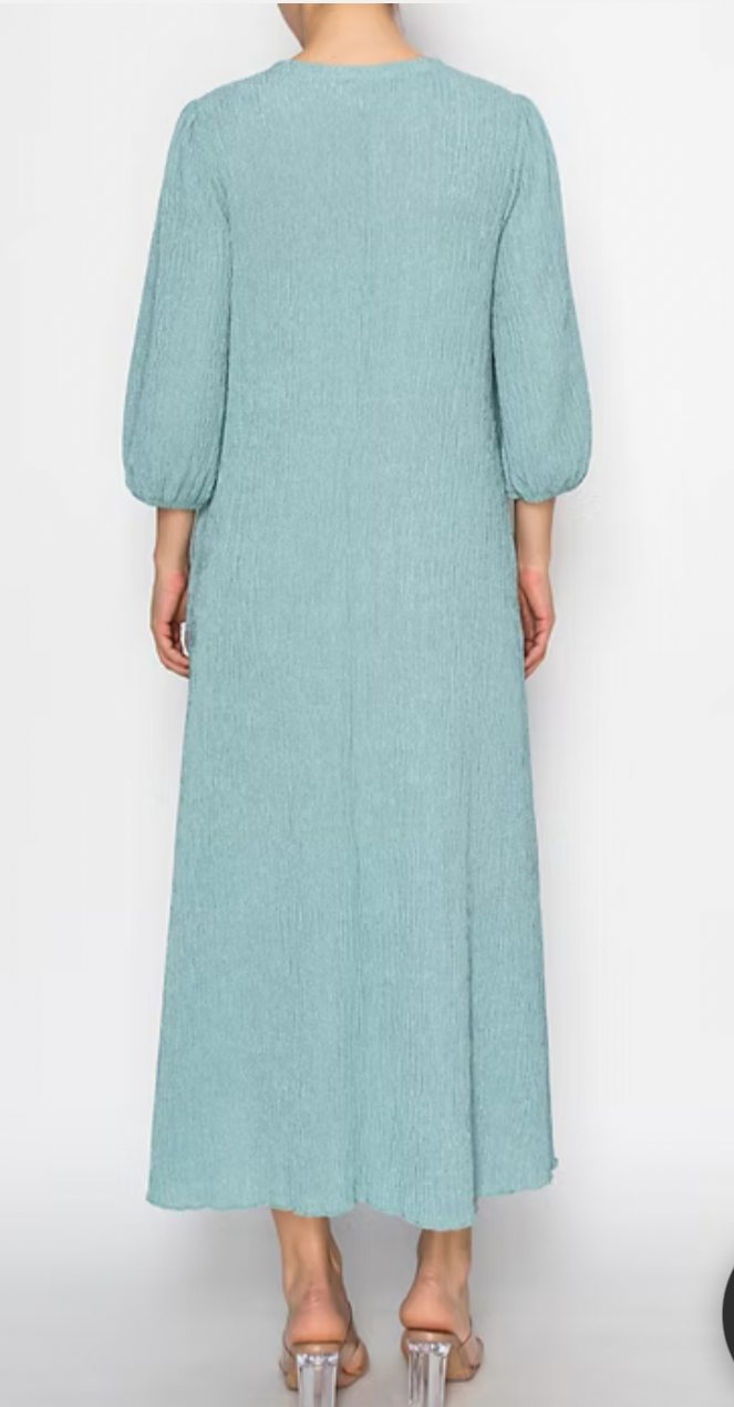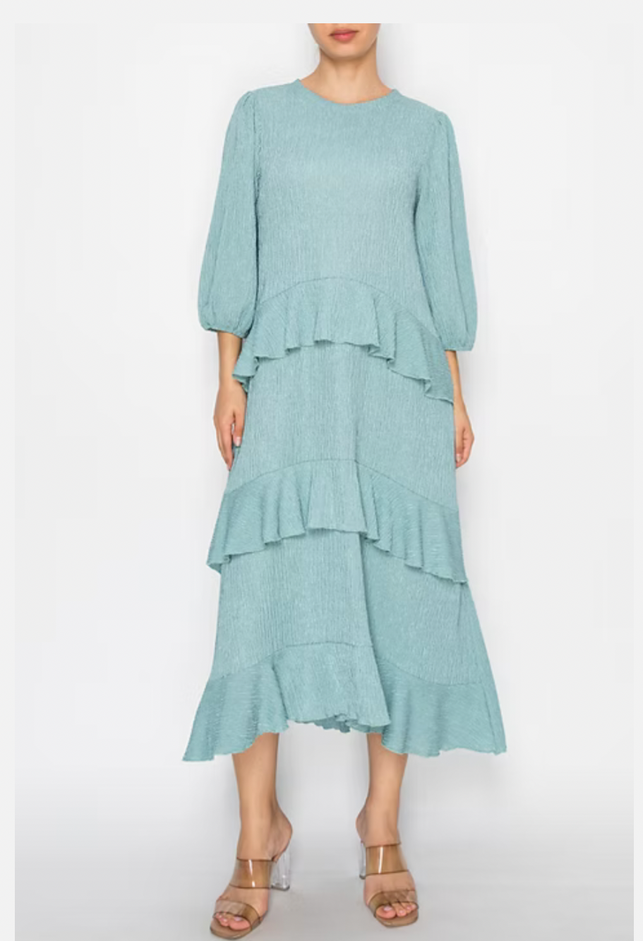 The Serena Dress in Sea Green features a round neck and 3/4 sleeves, complemented by front ruffles. Its elegant design ensures comfort, making it suitable for both casual and formal occasions. The combination of style and ease of wear enhances the overall aesthetic, promoting confidence in various settings.