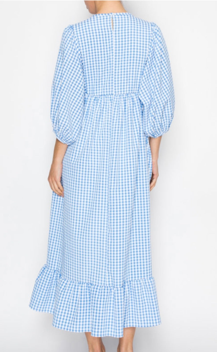The Lyndi Dress features a loose fit silhouette with 3/4 sleeves, in blue gingham. Its bottom ruffle adds a stylish element while ensuring comfort for all-day wear. This dress is designed to provide ease of movement, making it suitable for various occasions.