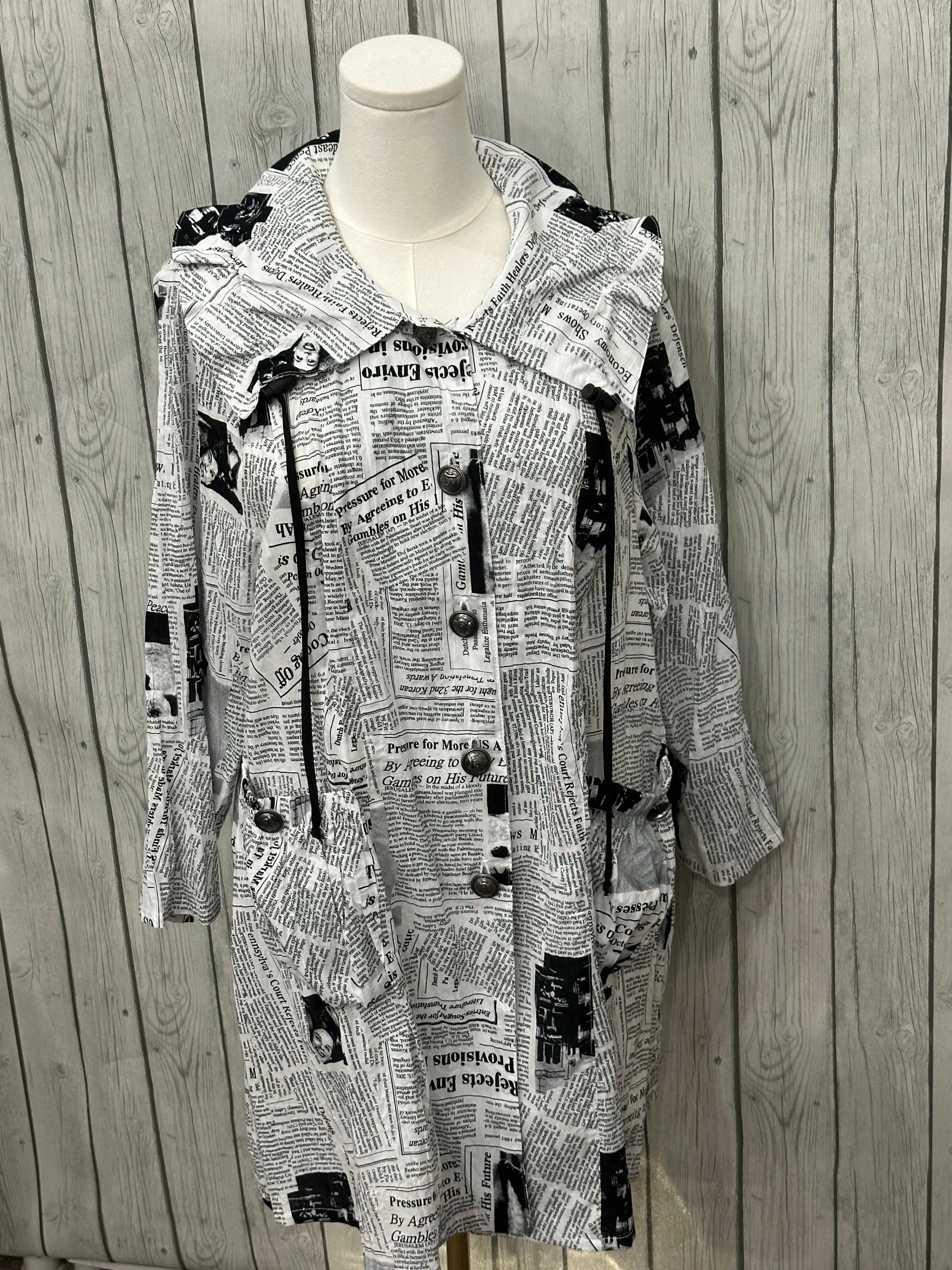 Introducing the Bethany Jacket - a fun and lightweight addition to your wardrobe. Made with a unique newsprint fabric, it features a button-up jacket style with a flattering, blouse-like fit. The large collar lays flat and the drawstring ties at the neckline add a touch of fun. Complete with medium size silver buttons and two front pockets, this jacket is both stylish and practical.
