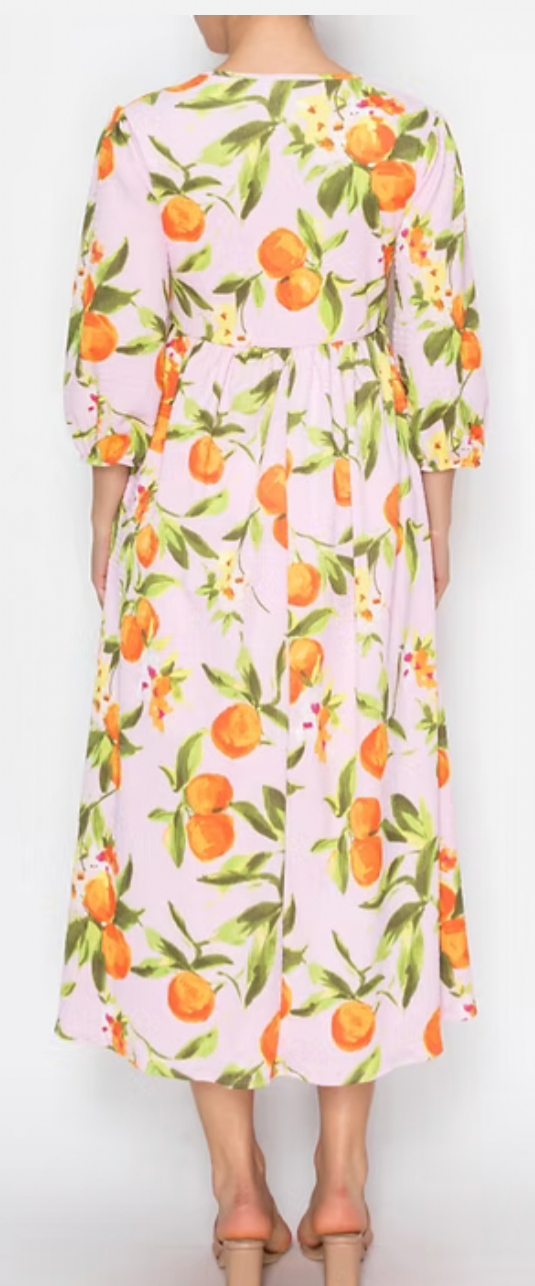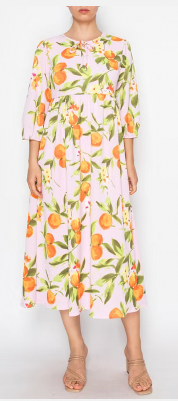 The Blossom Dress in Pink features a round neckline and 3/4 sleeves, providing a versatile style suitable for various occasions. The flowy midi length enhances movement and comfort, while the inclusion of side pockets adds practical functionality. This dress combines elegance with ease, making it an ideal choice for daily wear.