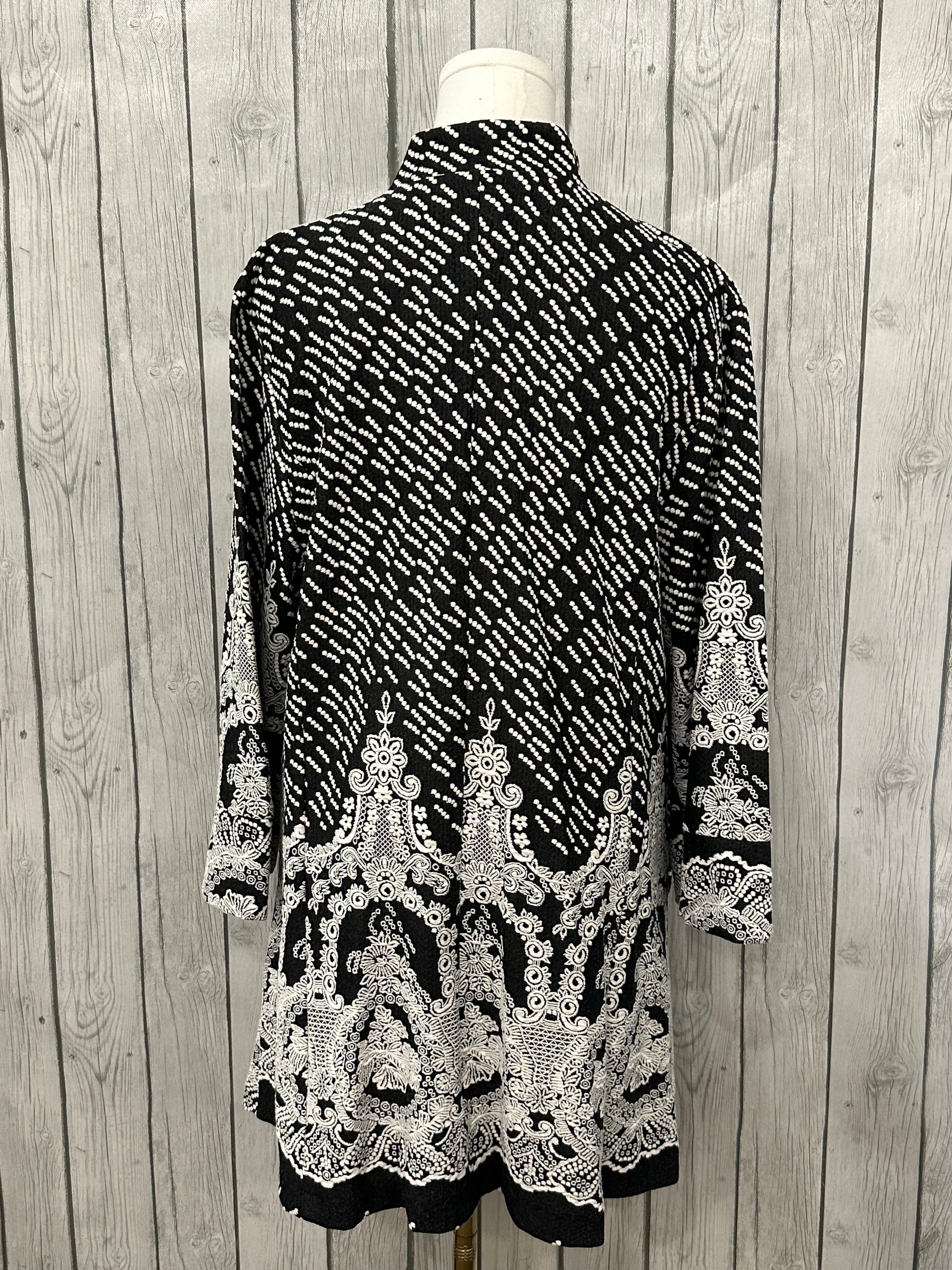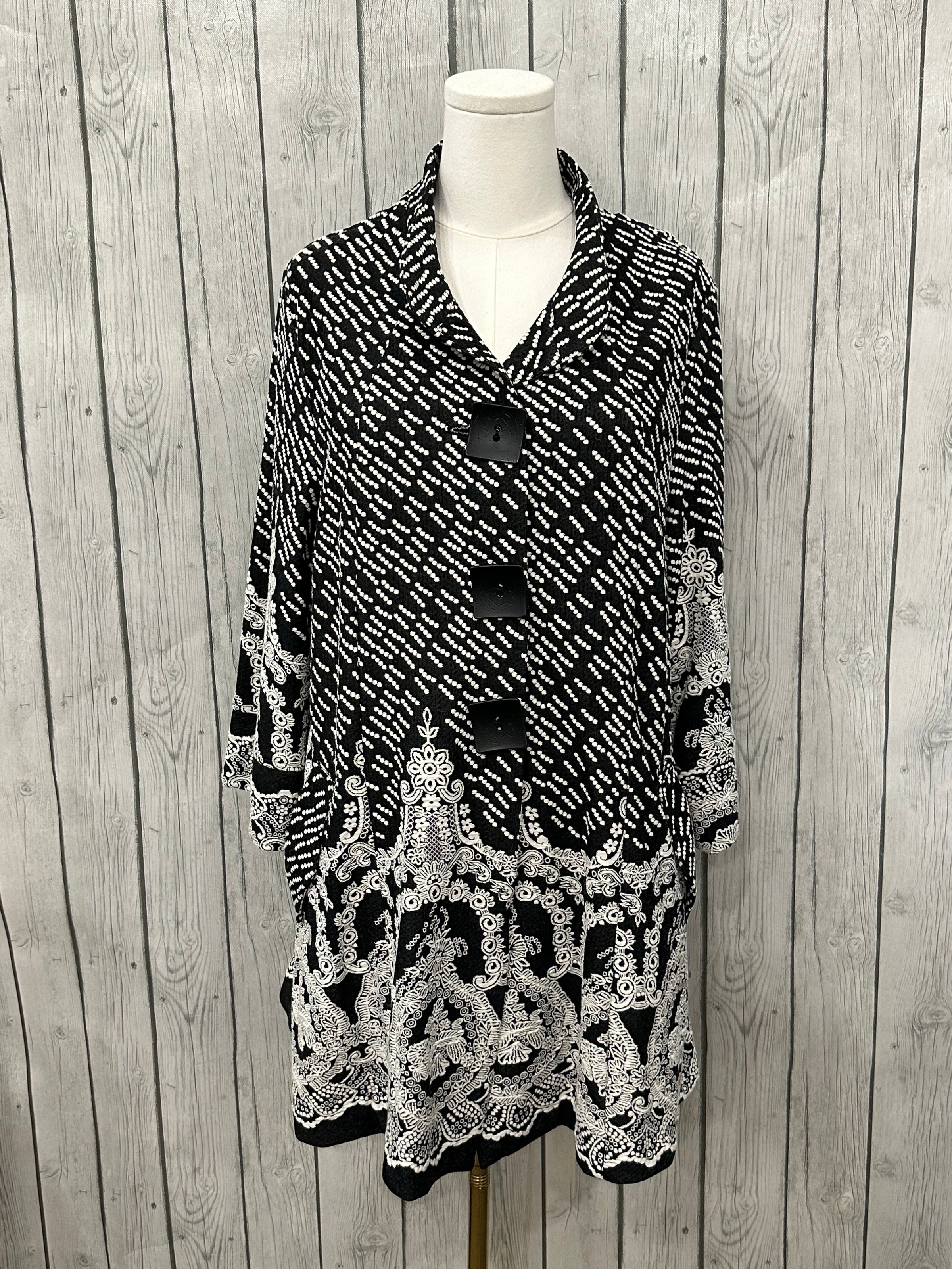 The Kennedy Jacket is crafted with soft black & cream fabric. This jacket features large front buttons, and a unique black and cream design. Perfect for both style and comfort.