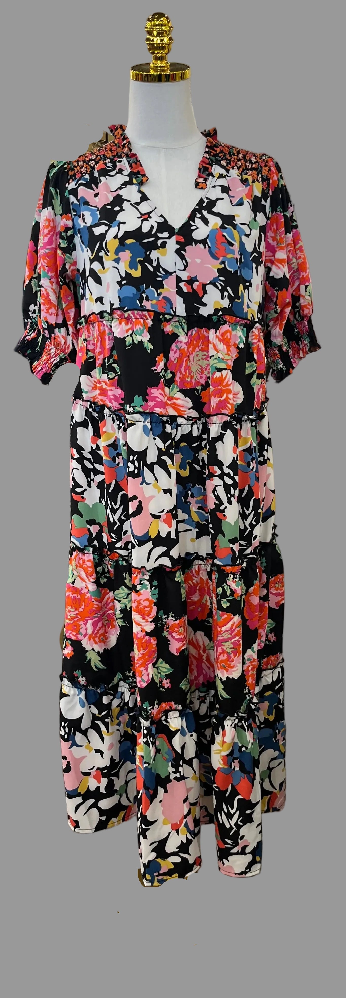 The Marta Dress in Black features a vee-neck design and elegant floral pattern, complemented by tiered layers and elbow-length sleeves. This dress offers a flattering silhouette, enhancing comfort while providing a sophisticated aesthetic suitable for various occasions. Its versatile style ensures it can be easily dressed up or down.