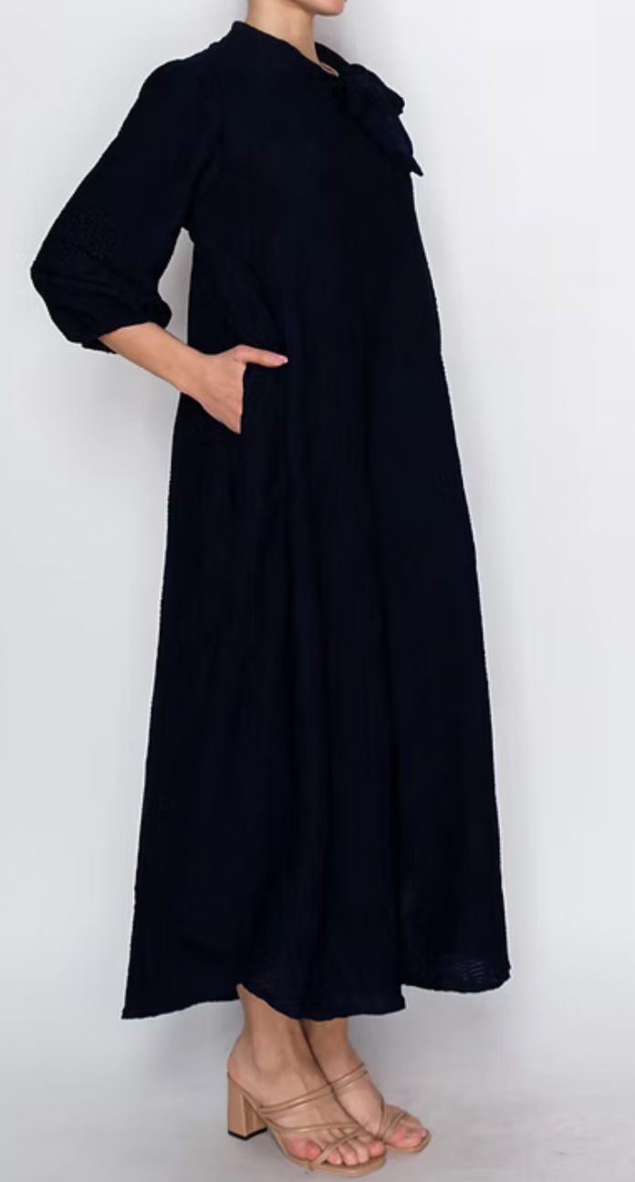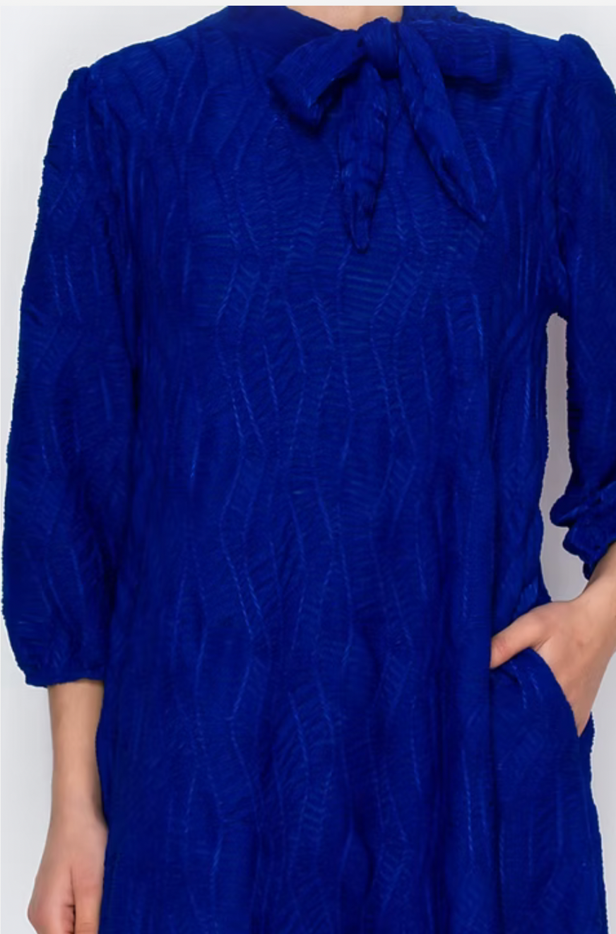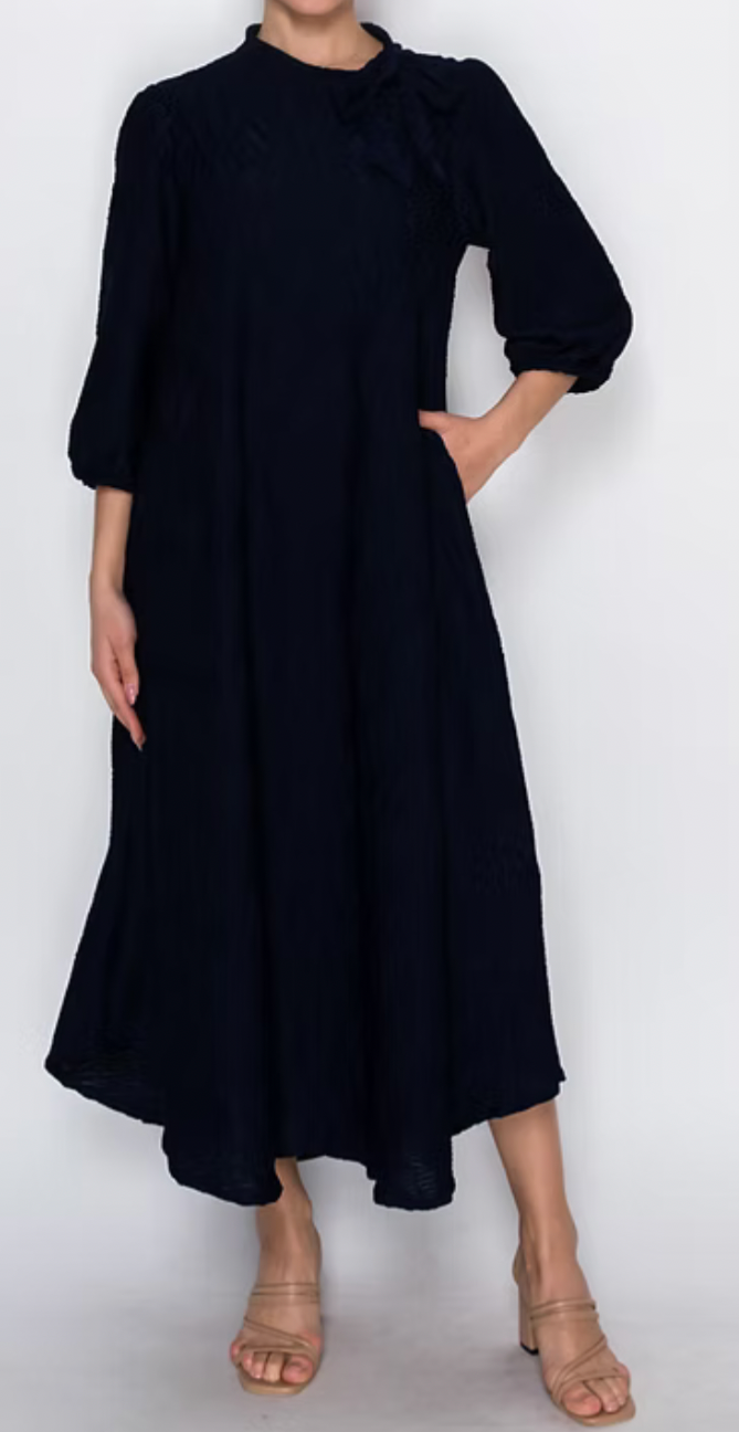 The Risa Dress features a textured fabric with a round neck and tie, complemented by 3/4 sleeves for versatile wear. Its flowy design and functional pockets enhance both comfort and practicality, making it suitable for various occasions. The elegant silhouette provides a sophisticated option for your wardrobe.