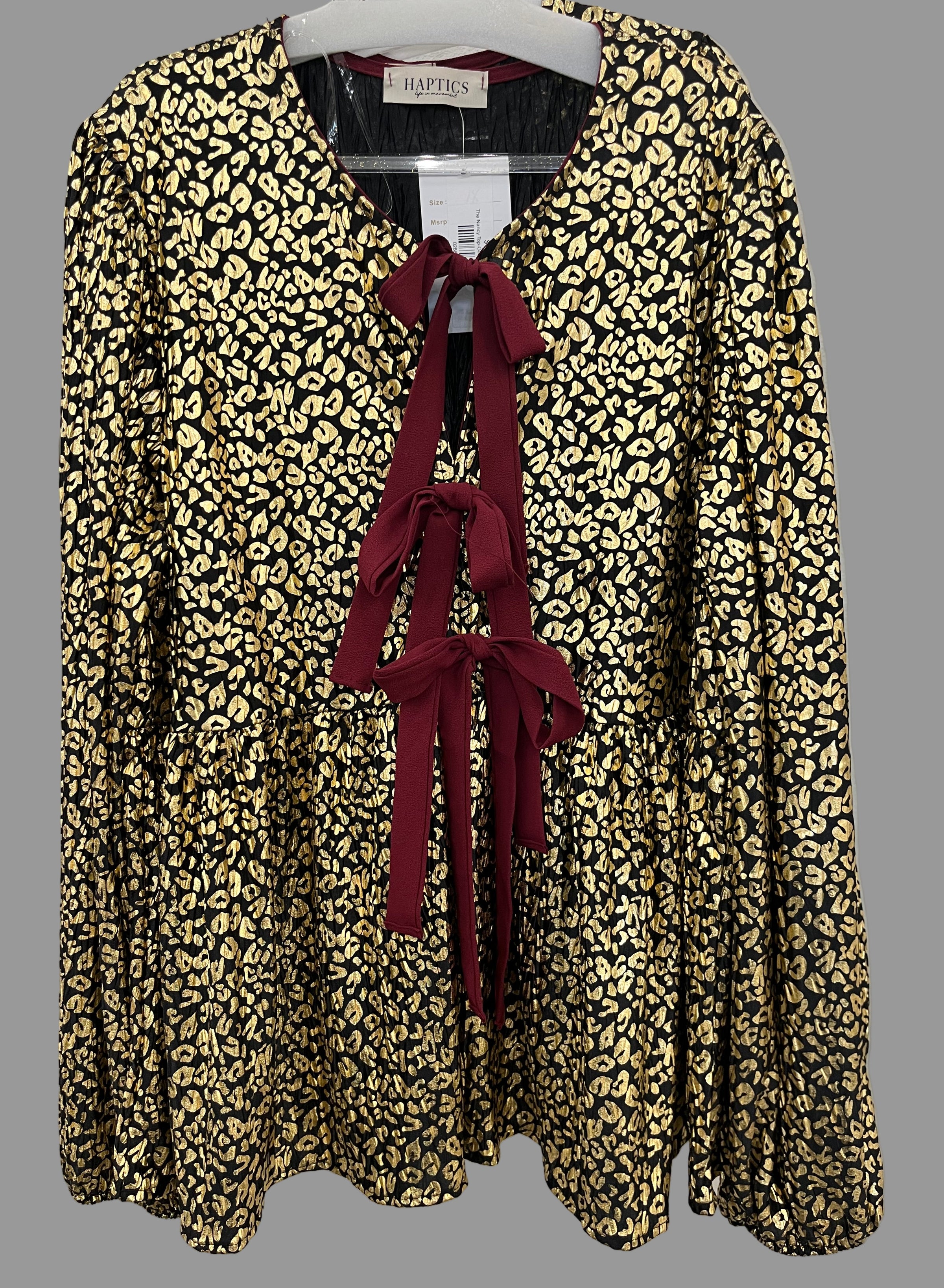 The Nancy Top features an elegant front bow detail paired with long sleeves for a polished silhouette. The standout element is the shiny gold and black animal print ruffle that cascades from the waist to the hem, adding movement and visual interest. This sophisticated piece balances classic styling with contemporary flair, making it versatile enough for both professional settings and elevated casual occasions.