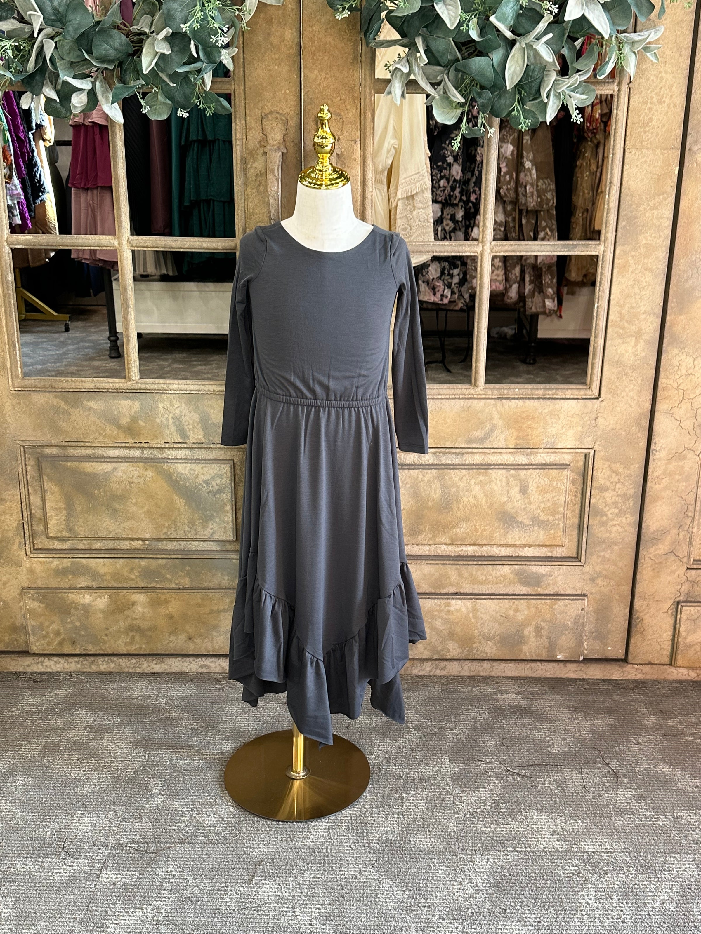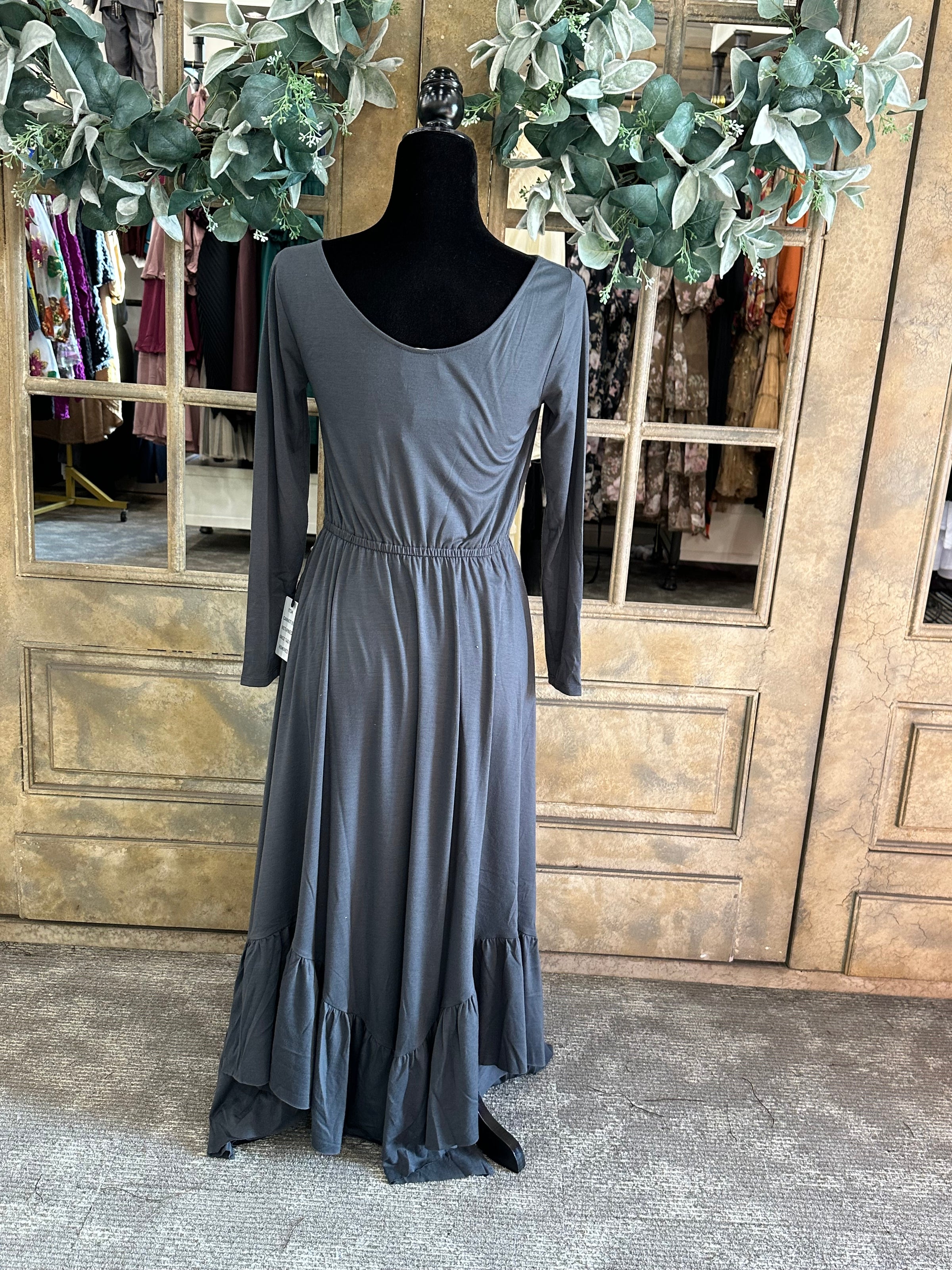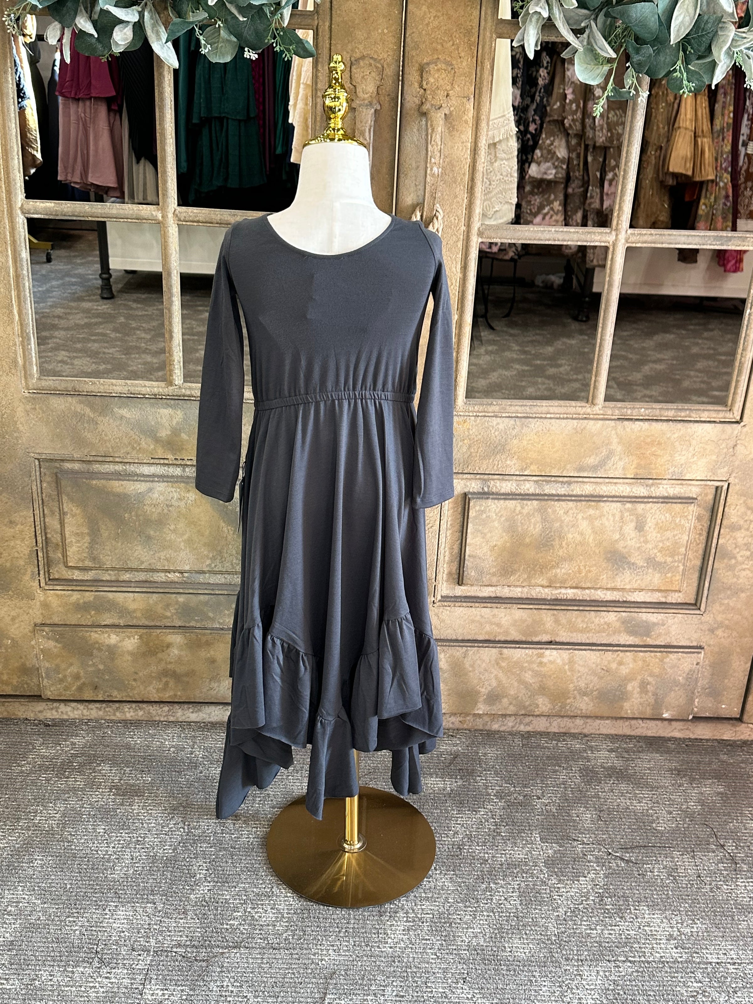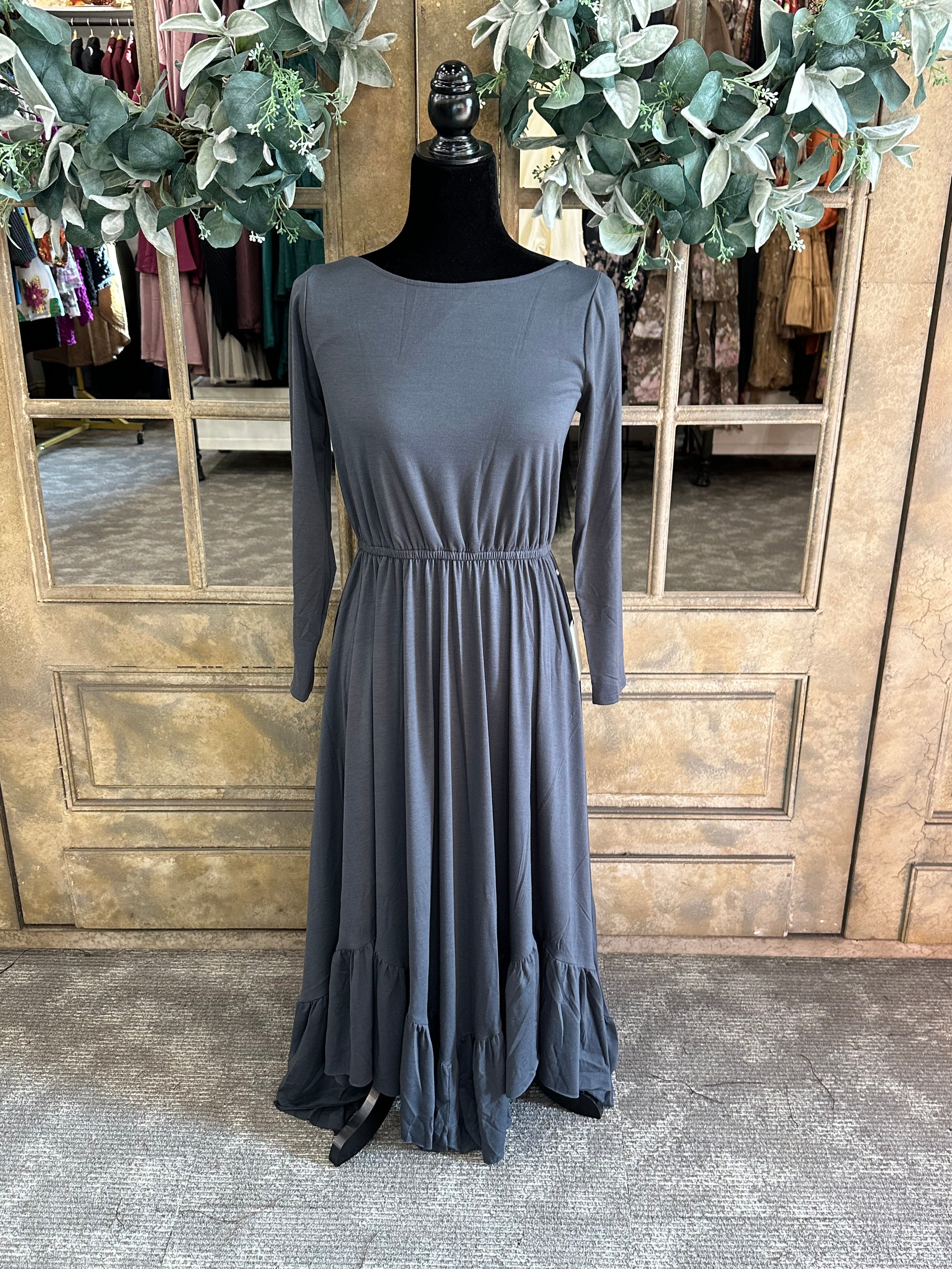 Made from a very soft gray cotton, this dress features long sleeves and an elastic waistband for a comfortable fit. Available in a variety of sizes, including youth and junior sizes.